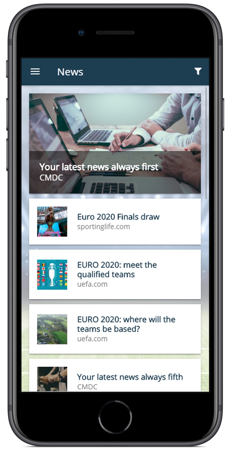 By posting catchy news stories or ads yourself, you can engage business relations. The App places your news items in the beginning and between the messages of general news feeds about the 2021 European Championships. This will get your news items extra attention.